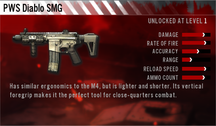 The PWS Diablo SMG is a very compact assault rifle (classed in game as a submachine gun) featured in Homefront. It is used by the American Resistance, United States Armed Forces, Survivalists, and Korean People's Army. It fires 5.56x45mm NATO at a rate of 750-900 rounds per minute. It has a similar design to the M4, but is lighter and shorter. Its vertical foregrip makes it the perfect tool for close-quarters combat